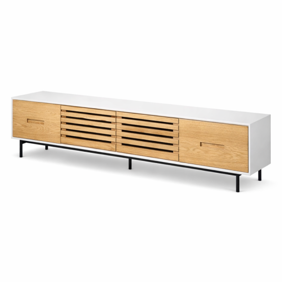 מזנון טליה משלב בין ניקיון מודרני לחמימות טבעית, עם גוף לבן חלק ודלתות בגימור עץ אלון עשיר בטקסטורה מודגשת. המרכז המעוצב עם שלבים אופקיים יוצר עניין ויזואלי עמוק ומעניק תחושת אווריריות ואלגנטיות. זהו פריט שמביא איזון מושלם בין פונקציונליות לעיצוב מוקפד.