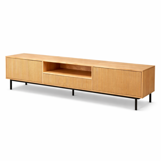 מזנון אלה משלב חמימות טבעית עם קווים מודרניים נקיים. חזיתות עם שלבים אנכיים עדינים יוצרות עומק וטקסטורה עשירה, בעוד הגוף הארוך והמאוזן מעניק תחושת יציבות ויוקרה. השילוב בין עץ בגוון טבעי לרגלי מתכת שחורות מדגיש קו עיצובי סקנדינבי עכשווי שמתאים לכל סלון מודרני.
